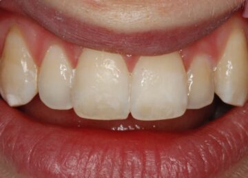 De patiënt klaagde over de witte vlekken op de vier voortanden en vroeg onze restauratieve / esthetische tandarts om een oplossing. De witte vlekken konden behandeld worden met een Icon behandeling. Bij een Icon behandeling wordt er een kunststof geïnfiltreerd in het poreus oppervlakte van de witte vlek. Om dit mogelijk te maken moet het oppervlakte van de tand behandeld worden zodat de porositeiten open komen te staan. Om te voorkomen dat het tandvlees geïrriteerd raakt worden de tanden eerst geïsoleerd met een blauwkleurig rubber lapje. daarna wordt er een zure gel aangebracht en een schuurmiddel. Na het licht opschuren van de oppervlakte van de vlek wordt het infiltraat (Icon) aangebracht. Dit wordt uitgehard, zoals bij een vulling, waarna de witte vlekken op de tanden bijna helemaal verdwijnen. Tot slot worden de tanden weer netjes gepolijst.